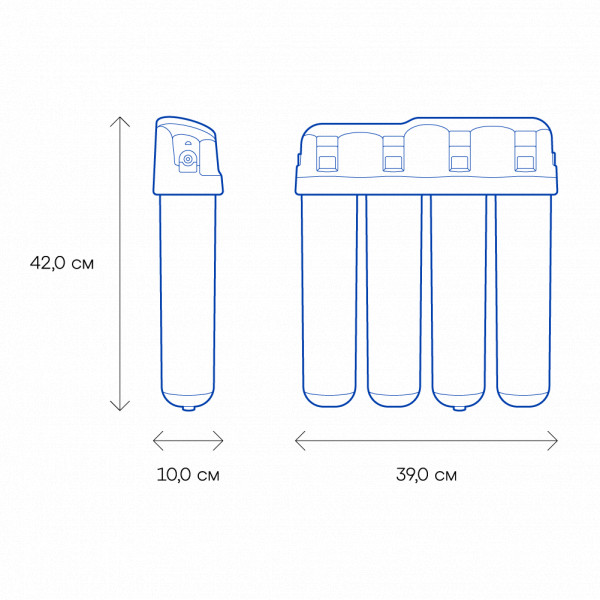 Обратноосмотические фильтры используются для абсолютной защиты от накипи, т.к. полностью устраняют соли жесткости из воды.даЧисло ступеней очисткиКартриджи последовательно очищают воду и от видимых примесей, и от растворенных. Первый картридж задерживает более крупные частицы, а каждый последующий - более мелкие. Чем больше ступеней - тем лучше фильтр очистит воду: поймает более мелкие видимые частицы ржавчины, песка и ила, успеет захватить из воды максимум растворенных примесей - хлора, нитратов, тяжелых металлов и других.4МинерализацияПроисходит после финишной очистки воды. Необходима прежде всего в фильтре обратного осмоса, поскольку такой фильтр полностью устраняет из воды все примеси, в том числе минералы. Минералы добавляются в оптимальной концентрации - для пользы и привычного вкуса воды.даПостфильтрацияФинальный этап очистки воды: картриджи постфильтрации удаляют самые мелкие механические частицы и кондиционируют воду, придавая ей более приятный вкус.даНакопительная емкостьОбычно нужна в фильтрах обратного осмоса. Глубокая фильтрация требует времени. Чтобы Вам не приходилось ждать, пока вода наберется в чайник или кастрюлю, почти во всех моделях используется накопительный бак для чистой воды или другая емкость. В стандартном фильтре обратного осмоса под мойку воды в баке достаточно для семьи из 5-6 человек.даФильтрующий модуль в комплектедаОтдельный крандаДавление в водопроводе не менее, атм3,5Давление в водопроводе не более, атмМаксимальное давление воды на входе в систему, при котором возможна стабильная работа фильтра.6,5Ширина, смОбратите внимание на габариты фильтра, и измерьте, сколько свободного пространства в предполагаемом месте установки.42,0Глубина, смОбратите внимание на габариты фильтра, и измерьте, сколько свободного пространства в предполагаемом месте установки.10,0Защита корпуса от гидроударовдаИсходная водаЖесткая вода – вода с избытком минеральных солей. От нее появляется накипь в чайнике, известковый налет на сантехнике и разводы на посуде. Мягкая вода – та, в которой мало минеральных солей. Нет накипи в чайнике и разводов на посуде. Фильтры для мутной воды и фильтры от ржавчины, как правило, имеют несколько стадий очистки и дополнительный полипропиленовый картридж. Он задерживает механические частицы ила, песка и ржавчины и защищает картриджи более глубокой очистки.любаяУстраняет мутностьМутность водопроводной воды может говорить о том, что в ней много мелких механических частиц. Важно, чтобы в фильтре был установлен дополнительные картридж механической предфильтрации (полипропиленовый) - он продлит жизнь остальным картриджам более тонкой очистки.даУстраняет ржавчину, бурый осадокЛюбой фильтр под мойку удалит из воды крупные и мелкие частицы ржавчины. Некоторые фильтры имеют повышенный ресурс по железу: они дольше служат в такой воде, поскольку лучше подходят для удаления из воды железа и механических частиц ржавчины.даЗащита от бактерийВсе проточные фильтры в той или иной степени защищают от бактерий. Например, добавление серебра препятствует их размножению. Это стандартная степень защиты. Если в семье есть дети, пожилые люди или аллергики, воду рекомендуется обеззараживать, то есть полностью удалять микроорганизмы. Повышенную защиту от бактерий дают фильтры с половолок