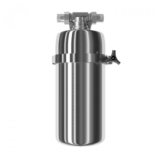 Магистральный фильтр среднего размера. Модель оснащена быстросъемным креплением «американка». Нижний полукорпус изготовлен из нержавеющей стали марки AISI 316, особенно устойчивой к коррозии и высоким температурам.